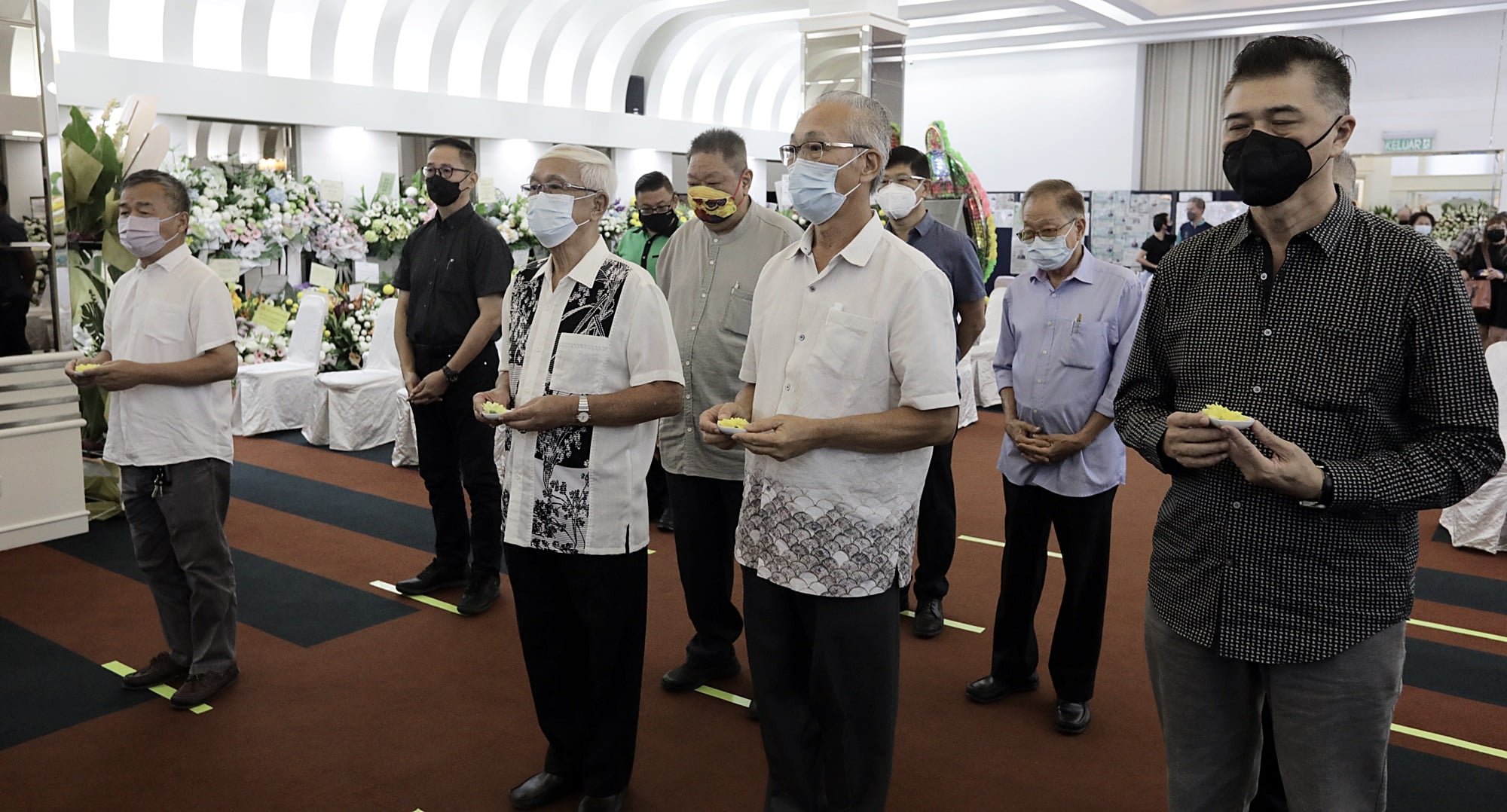 李振光(中)带领吉隆坡义山理事一行人,周五到陈凯希灵前献花,致最后的敬意。(辛柄耀摄)
