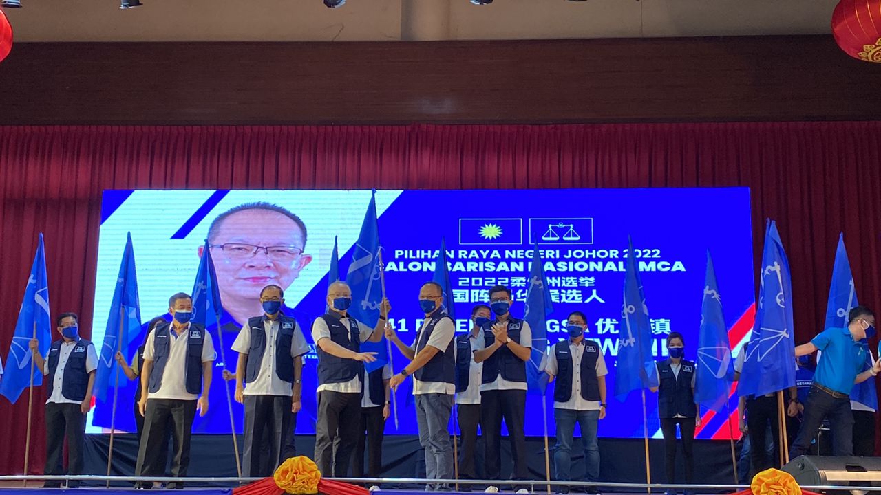 为了提振士气,马华也在庆典上为柔佛州选举行造势活动,在逐一介绍候选人后,由魏家祥授旗给15名候选人。