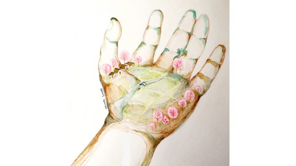 大概潜意识作祟,加上我对该文的喜爱意犹未尽,隔天我开始构思一幅画,打算记录心中的〈桃花源记〉。未下笔前,我请先生拍摄我的和他的左掌,供作画参考。我是左撇子,选择以左掌为主要图像,掌代表人的作息,亦铺满生命线。我把掌心画成田地,有房舍,如生活;以五指为山,像充满挑战的苦境,亦是他日回甘后的美景;以纹线为阡陌交通,有路有河,宛如际遇,又如自我的安排。我也在中指和无名指之间的缝隙加了一挂瀑布,水是生命的起源啊!图里当然少不了文中的房子和被渔夫舍去后又取用的小舟。我将陶渊明的桃花源迁入手掌,但愿时刻宛如良辰美景,桃花处处开。