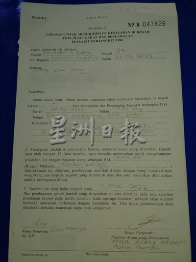 (新山26日讯)星洲日报记者今日上午9时在新山县公共工程局多元礼堂的提名中心进行采访时,被卫生局官员以违规为由而当场被开单罚1000令吉的事件,经媒体报道后,引起广泛关注,首相办公室和卫生部长凯里已在了解事发经过后,着手处理。