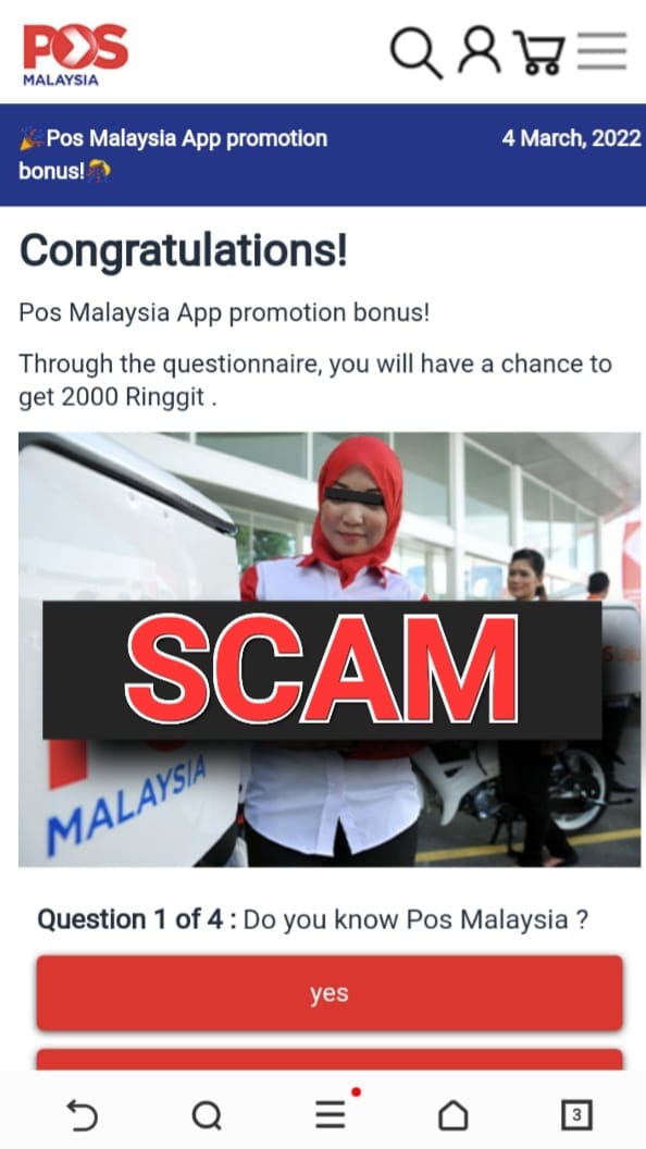 该公司昨日在脸书上传的截图显示,线上诈骗声称Pos Malaysia应用程式正进行促销活动,民众填写调查问卷后,便有机会赢取2000令吉。