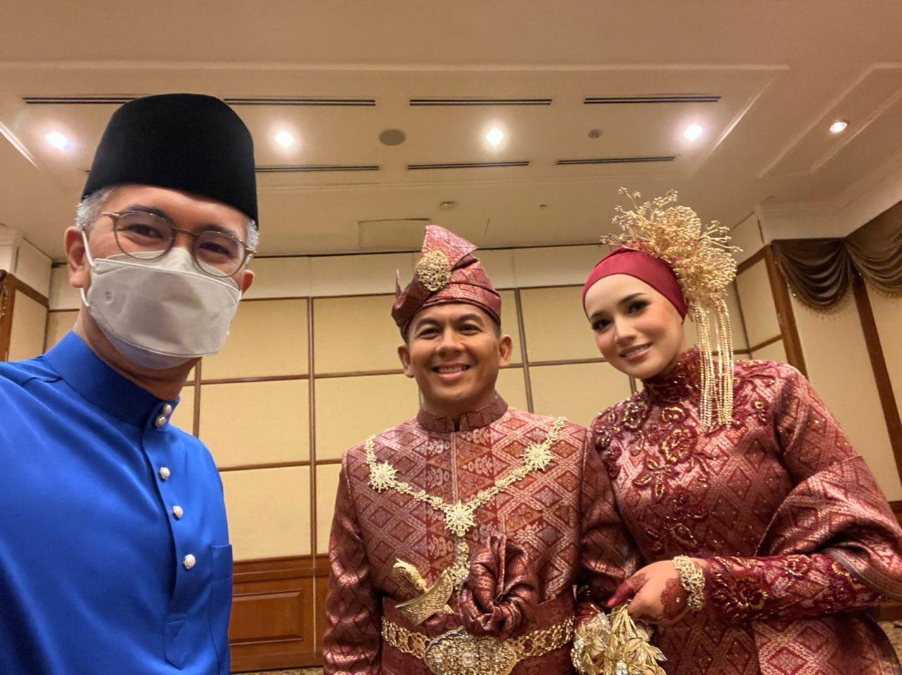 财政部长东姑赛夫鲁今天在脸书发帖祝贺莫哈末沙哈新婚快乐,并上载他与一对新人在婚礼上的合照。