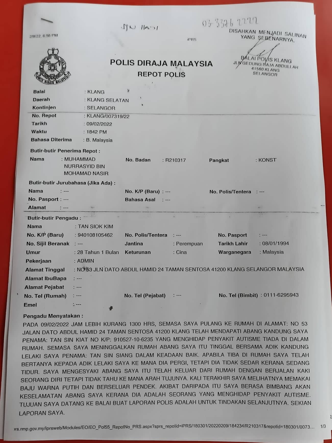 陈丽丽表示,儿子不见后,她在女儿陈素琴(28岁)陪同下,前往巴生南区警局报案,警方表示会出动警力巡逻,吩咐他们在家中等待消息。