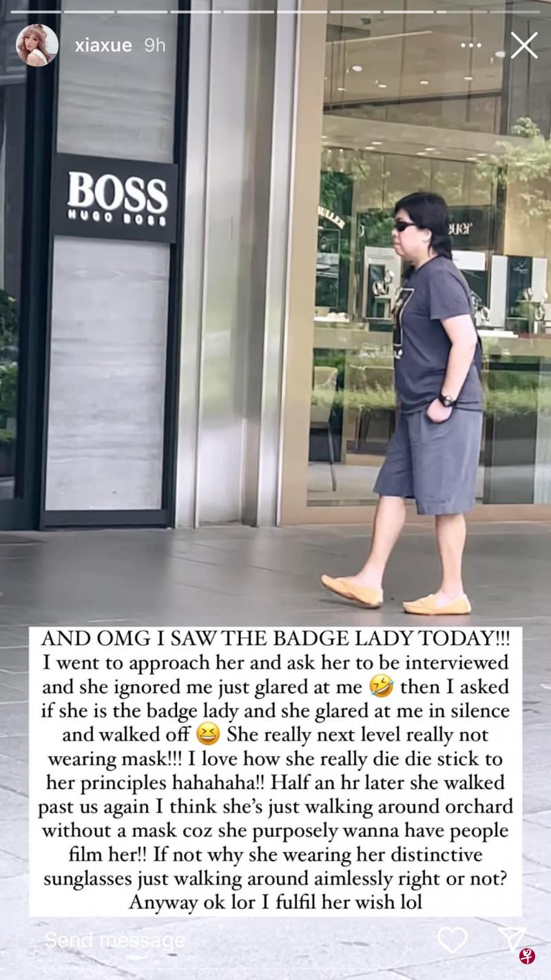 近期,出狱后的她被发现仍不戴口罩就外出,网红“下雪”上星期日(6日)发的Instastory限时动态,就拍到潘秋玉没戴口罩在乌节路逛街。