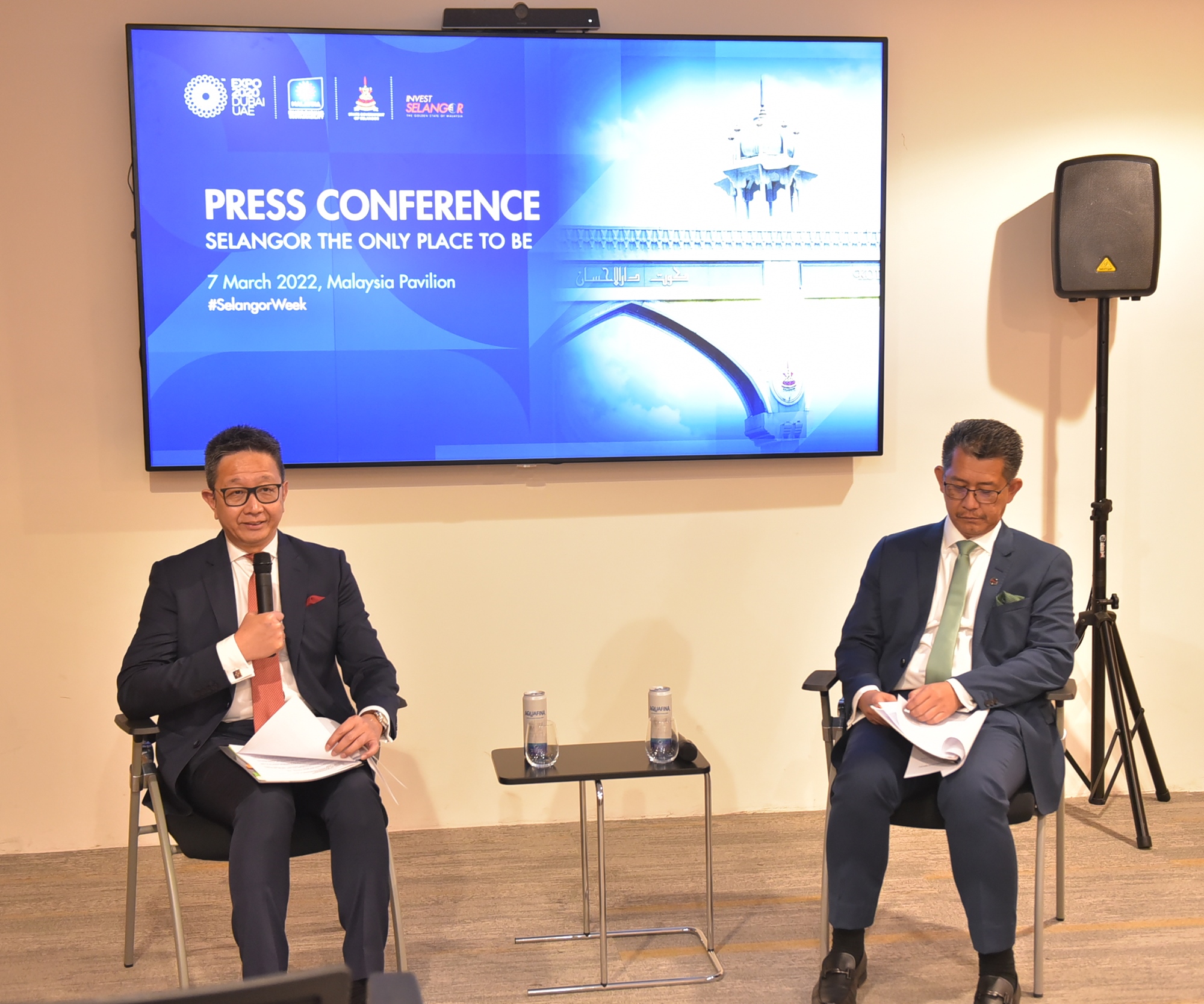 邓章钦(左)和哈山召开新闻发布会,阐述雪兰莪周在迪拜世博会大马馆取得的效益。(雪工商常委会提供)