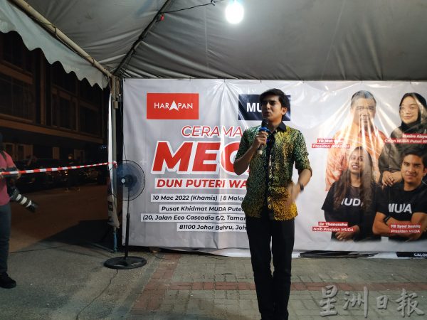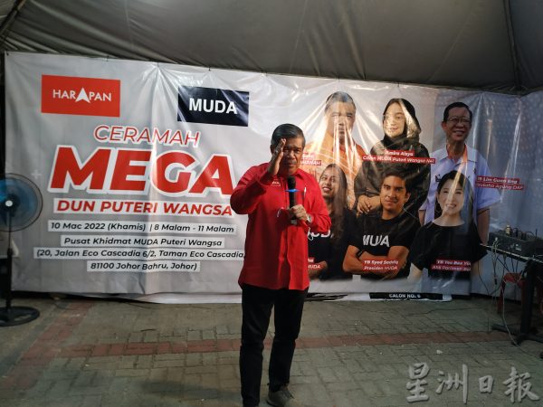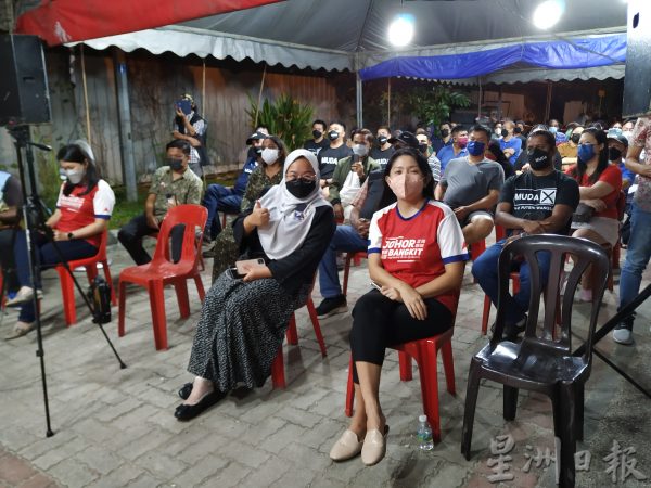 (新山10日讯)亲希盟的大马民主联合阵线(MUDA)优景镇候选人阿米拉爱莎,今晚举办竞选期内的最后一场政治讲座,获得该党主席赛沙迪、诚信党主席莫哈末沙布、行动党峇吉里国会议员杨美盈等热情站台,让她与团队充满力量继续奋战。