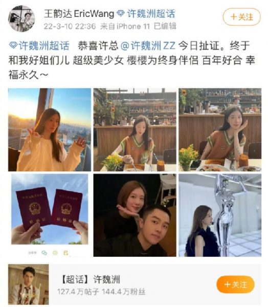(北京11日讯) 凭BL剧《上瘾》走红的中国男星许魏洲昨天13:14无预警晒出结婚证书宣布结婚,喜讯震撼各界。因为他对恋情保护到家,女方的身分受到许多网民的猜测,不料妻子仍被爆出是高中学姐,低调交往4年修成正果,女方友人还主动晒出照片,而且同时发表在许魏洲超话,虽让吃瓜群众终于看到新任许太太的高颜值,然而此举却遭批是猪队友,辜负了许魏洲欲保护老婆隐私的初衷。