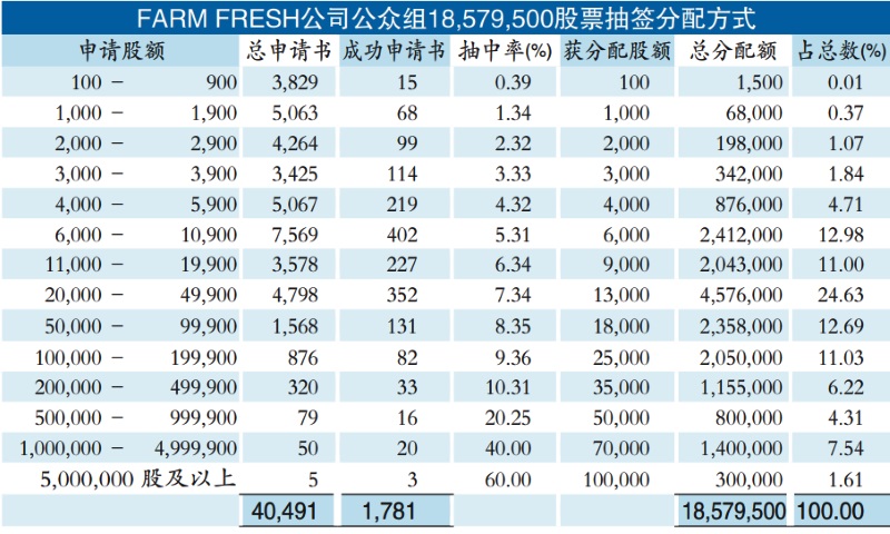 其中,供土著投资者申购的部份收到1万1218封申请书,共认购1亿1834万4600股,相等于5.37倍超额认购率。剩余供公众认购的股票接获3万4476宗申请,共认购6亿1520万股,超额认购率32.11倍。