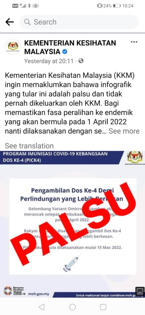 网络流传一张题为“为获得更有效的保护接种第四针”的信息图,称变种毒株奥密克戎(Omicron)在4月1日开放国家边境后会更活跃,因此建议人民接种第四针疫苗加强保护,并称该计划将从3月15日展开。