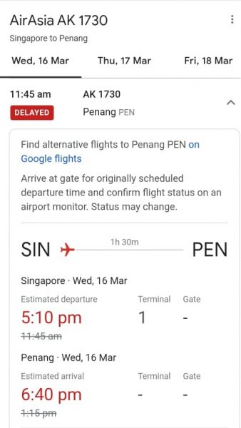 根据亚航网站,这趟航班(AK1730)原定于上午11时45分从新加坡起飞,下午1时15分抵达,后来推迟至傍晚6时40分抵达。