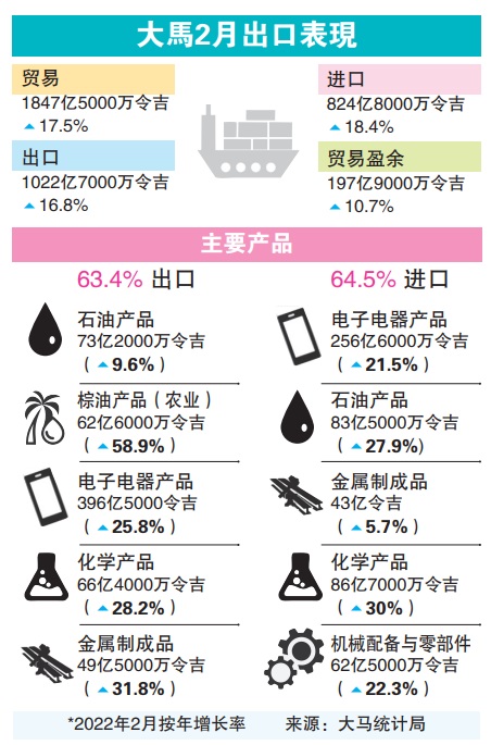 今年首2个月,大马出口与进口各增长20.4%与22.6%,总贸易与贸易盈余升21.4%和11.2%。