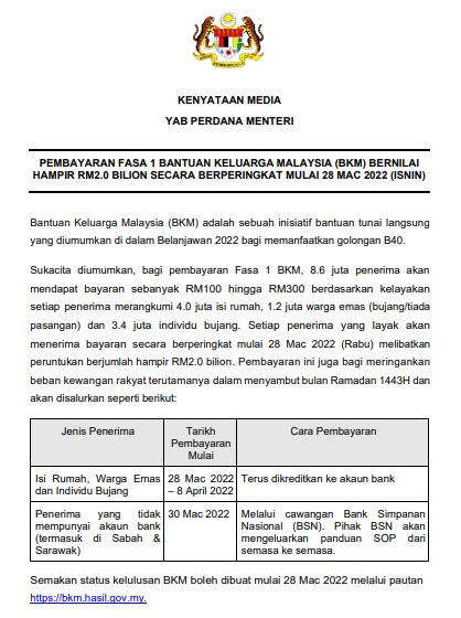 人民可从3月28日起到大马一家援助金的官网(https://bkm.hasil.gov.my),查询申请结果。
