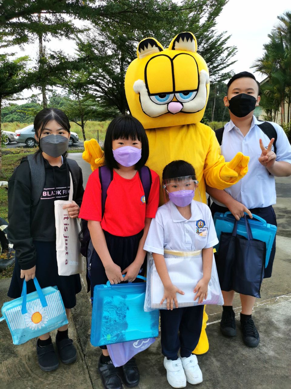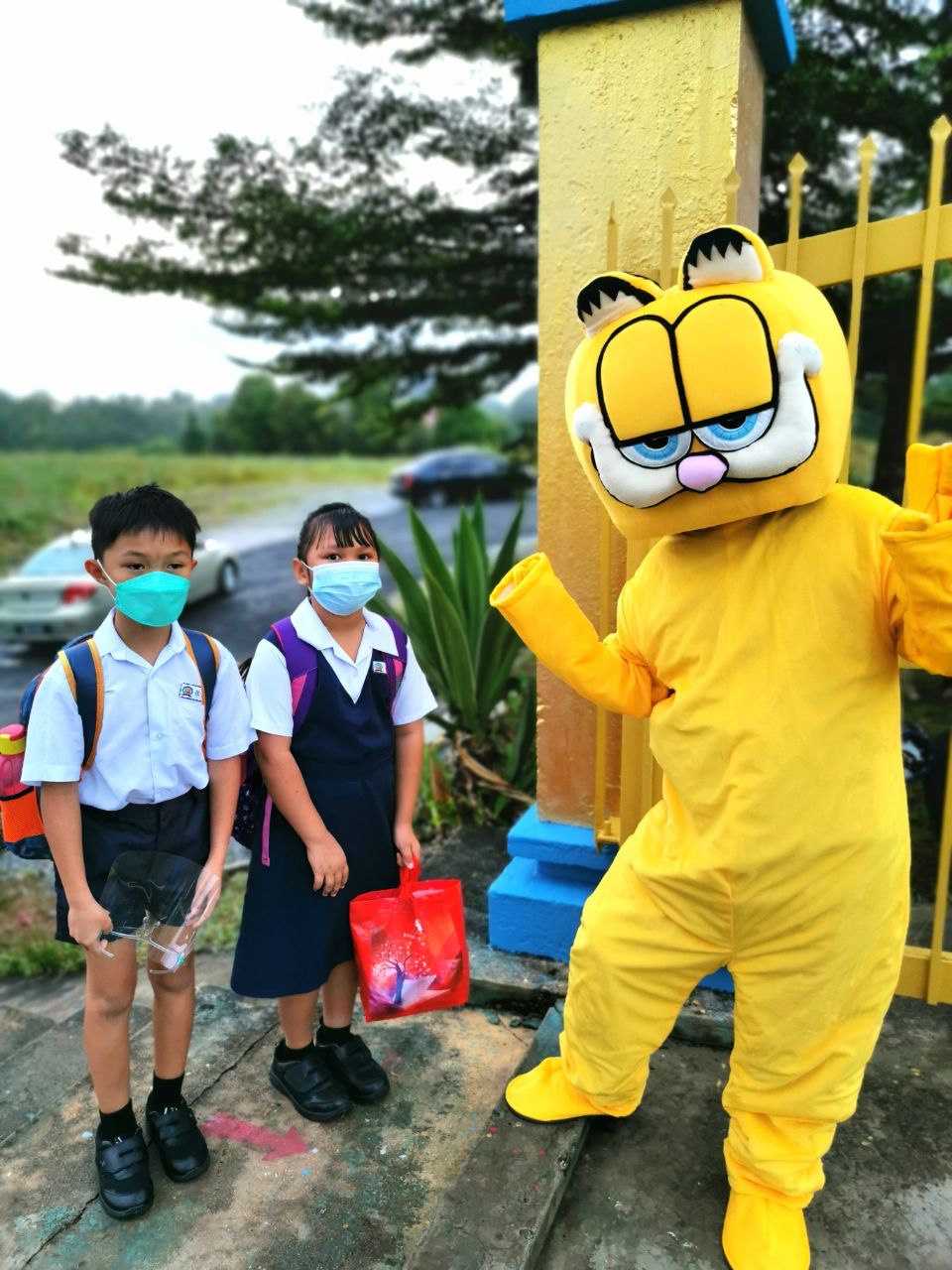 (古晋21日讯)新学年伊始,短廊中公校长李猷列按惯例以卡通人物造型迎接新生报到!这个新学期,他以看似懵懂爱睡却十分可爱的“加菲猫”造型和学生见面。