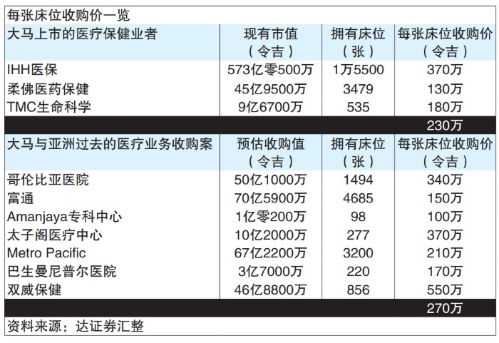 另一方面,达证券点出,在我国兴建一家医院的每张床位资本开销普遍约为140万令吉,但若以收购形式来看,在参考近年亚洲及大马的医疗业务收购案,每张床位的平均收购价为270万令吉。
