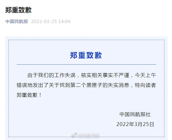 中国民航报微信公众号发布的《郑重致歉》全文如下:“由于我们的工作失误,核实相关事实不严谨,今天上午错误地发出了关于找到第二个黑匣子(黑箱)的失实消息,特向读者郑重致歉!”