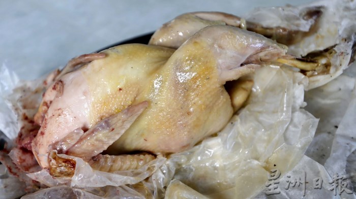 约有40年历史的宋溪新记盐焗鸡负责人侯郿燕指出,盐焗鸡沿用母亲传授下来的传统材烧方式焗成,在甘榜鸡的肚子里抹了姜茸,再用油纸包起来,包好后放进大锅用粗盐焗,需要一小时左右才完成。