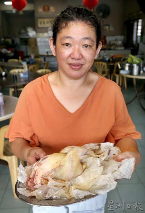 她的母亲从前常以盐焗鸡来滋补身体,滋补美味的盐焗鸡渐渐变成店内的招牌美食,吸引不少游客慕名而来。盐焗鸡的价格视重量和当时的鸡价而定,每只大约40令吉。