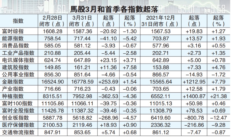 总结3月,马股月初延续2月强劲走势,更一度冲上1618.54高位,但在投资者忧虑乌俄战事未歇恐加剧通膨压力、联储局如期升息、中国疫情卷土重来等利空狙击下,指数涨势嘎然而止,更一度跌至1546.87点地位。