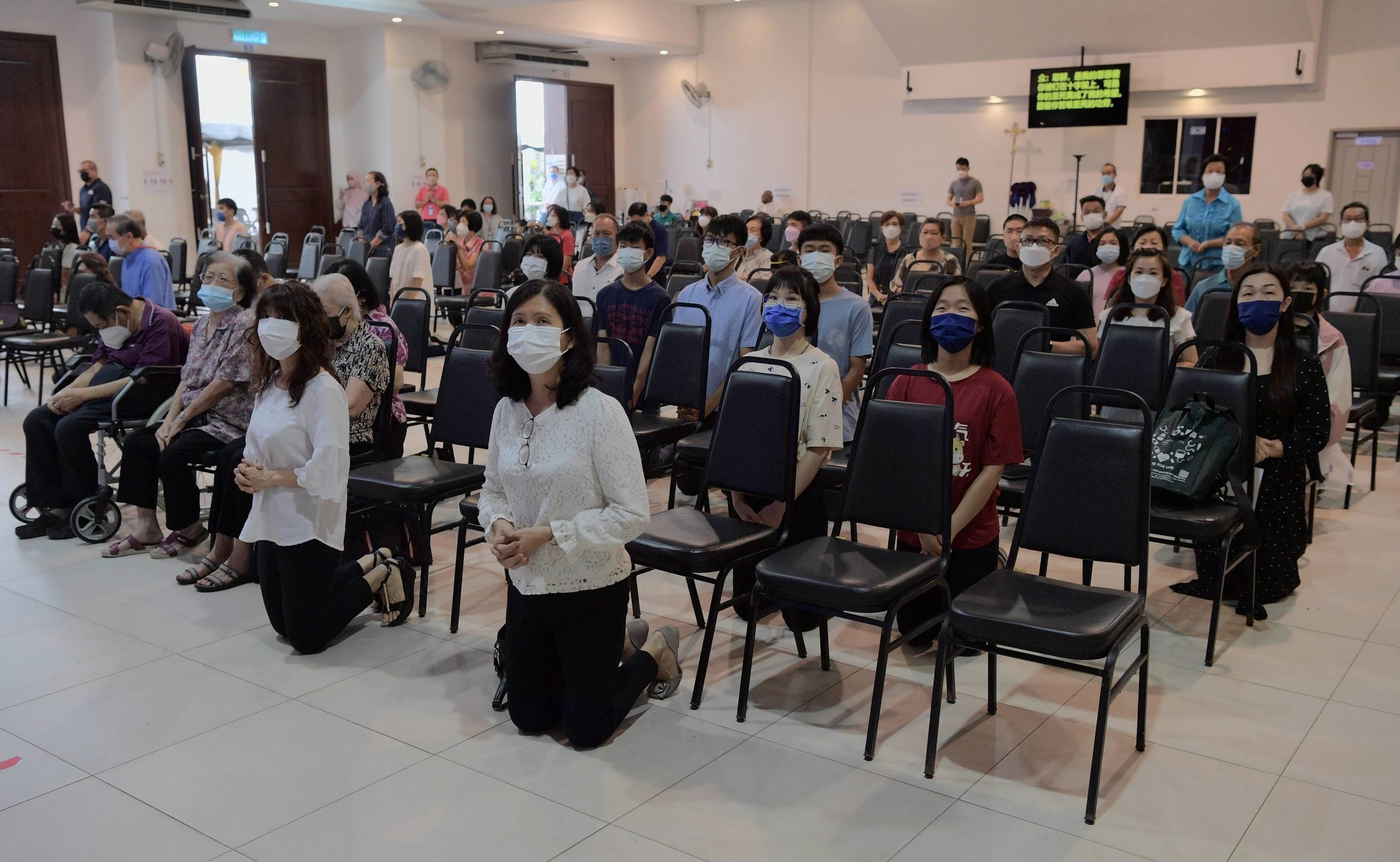 信众皆戴口罩消毒双手 天主堂弥撒 无身距限制