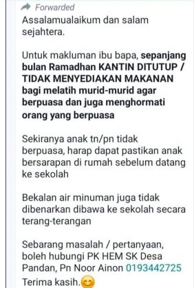 据网媒mStar报导,该校一名老师日前发信息给家长们表示,该校的食堂将会在斋戒月关闭,好让穆斯林学生们学会斋戒,同时要求其他学生对斋戒者表达尊重。