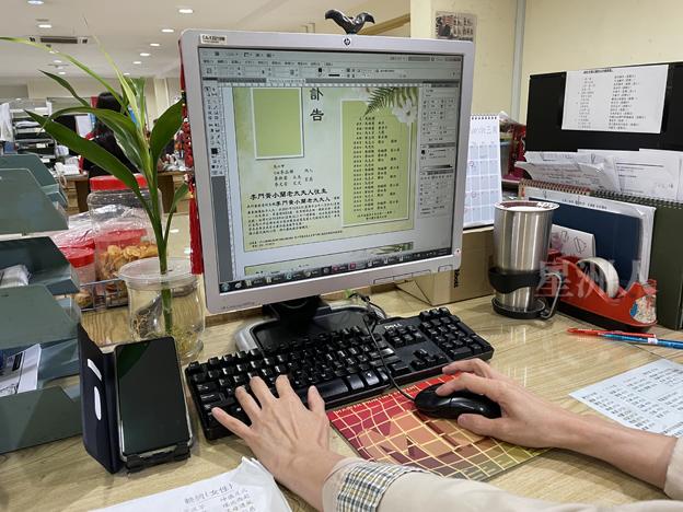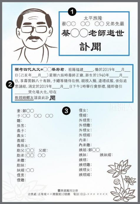 现代人办丧,多半交由报馆广告员或殡葬公司处理。业务员甚至不用前往丧府,丧家只需透过通讯软体呈交逝者的基本资料和家属名单,对方随即回传一份草稿,核对无误后,讣告就写好了。