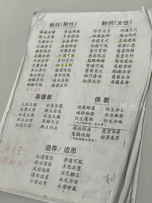 星洲日报常用的挽词用语,按照性别、宗教分类。(摄影:本刊 白慧琪)
