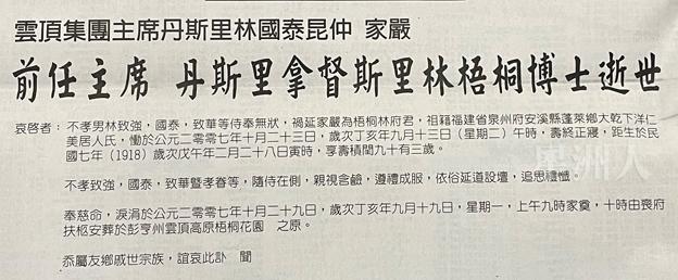 2007年云顶集团前主席丹斯里林梧桐逝世时的讣告,用字非常传统,例如“哀启者”(陈述事情的发语词)“祸延(表述自责之情)”。(本报资料中心)