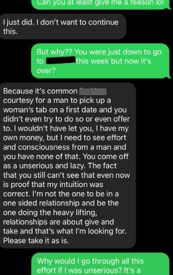 有网民在Reddit论坛上上传这对男女的聊天截图,结束第一次约会后,女方直接拒绝再与男子约会,追问原因后,才得知因为没有主动付钱请喝咖啡。