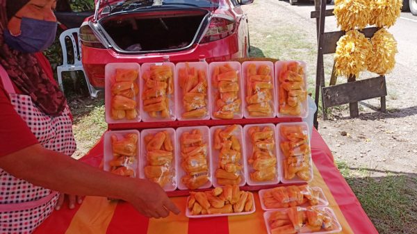 马力伯伯喜滋滋的把装盒的果肉拿到市集去卖,反应很好。雄心万丈的他开启了“走江湖生涯”,逐个村子游走,早市或夜市都可以见到他身影。货源不足时,还会向朋友收购,批发价每公斤大概3.5令吉,收入依旧可观。