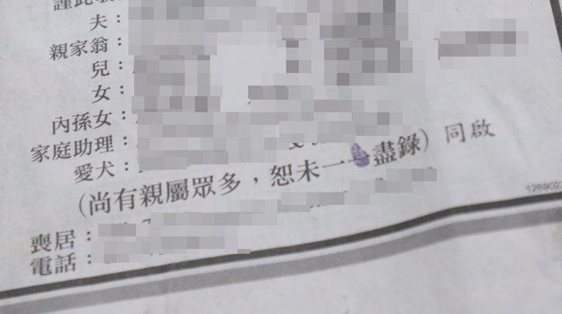 富豪逝世后,家属欲刊登讣告,到底该不该记下这名儿媳,和不同姓氏继孙的名字?许铭江说,当时处理这则讣告,前后修改过好几次。打印草稿让家属检查的时候,又一直有电话打来找他。结果阴错阳差,这名继孙的名字没被列入,或许是冥冥中从了富豪的遗愿。