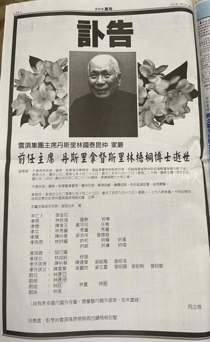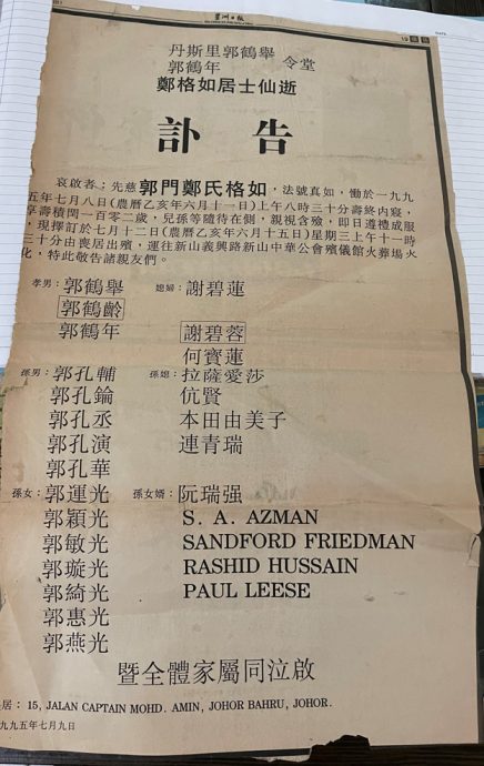 新山文史工作者舒庆祥在星洲日报广告处工作50年,处理讣告,也收藏讣告。有一则讣告不是他经手的,收藏原因是觉得特别有趣、少见——逝者家属把家庭助理和爱犬的名字也列入名单中。