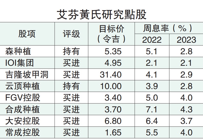 整体而言,该行维持种植业的“加码”评级,首选股为吉隆坡甲洞(KLK,2445,主板种植组)、大安控股(TAANN,5012,主板工业产品组)和合成种植(HSPLANT,5138,主板种植组)。