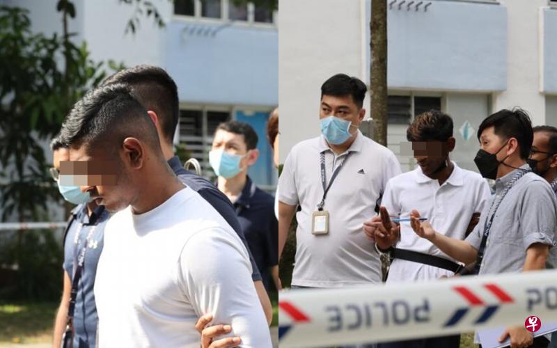 (新加坡8日讯)涉嫌在文礼持刀砍伤两人的两名嫌犯,被带回现场重组案情。