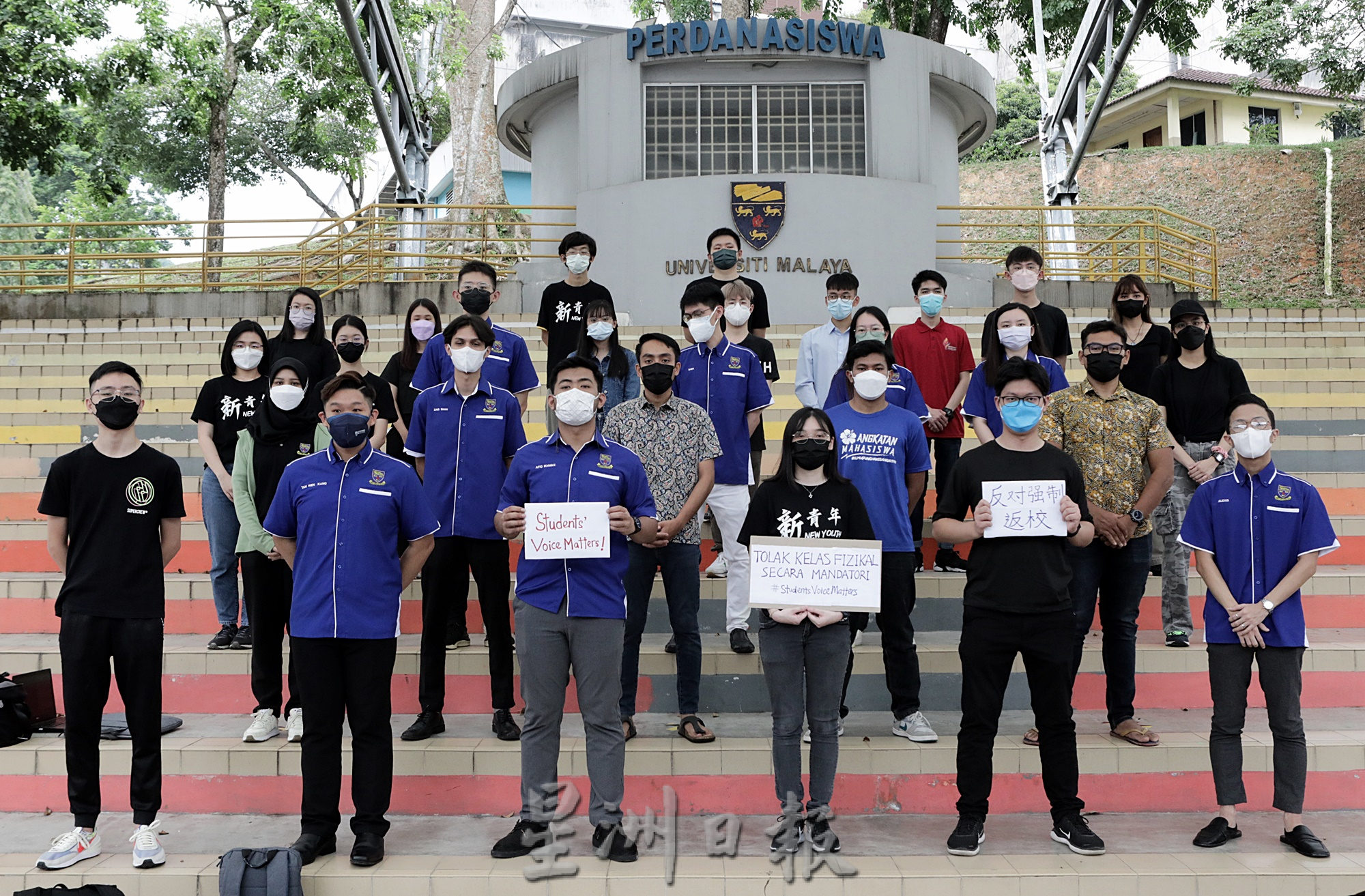 马来亚大学的廖品淳(前排右三)和万阿菲克(前排左三)与拉曼大学学院和拉曼大学的学生会代表,联合对校方处理恢复实体课和考试表达不满。前排左起是许领贤和陈文康;右起是阿末扎尔凡和孔德善。(辛柄耀摄)