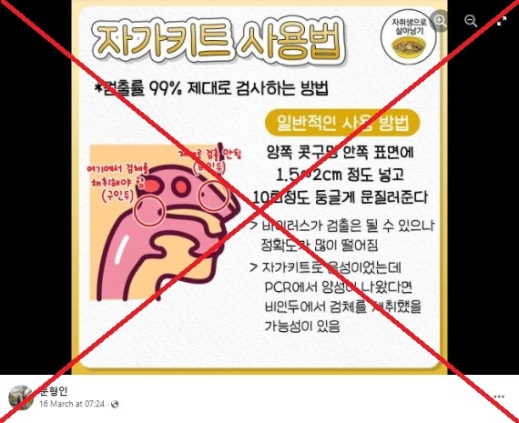 这个以韩语为媒介的帖文,附上鼻子和喉咙的解剖结构图,教导人们如何正确使用自检试剂盒,确保99%的准确率,认为常用方式从鼻孔1.5至2厘米取样的准确度不高,应该深入喉咙后部。