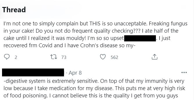 “我不是一个爱投诉的人,但这令人接受不到!你的蛋糕上有霉菌!你们不常做品质检查的吗?我吃了一半才发现它是发霉的!”