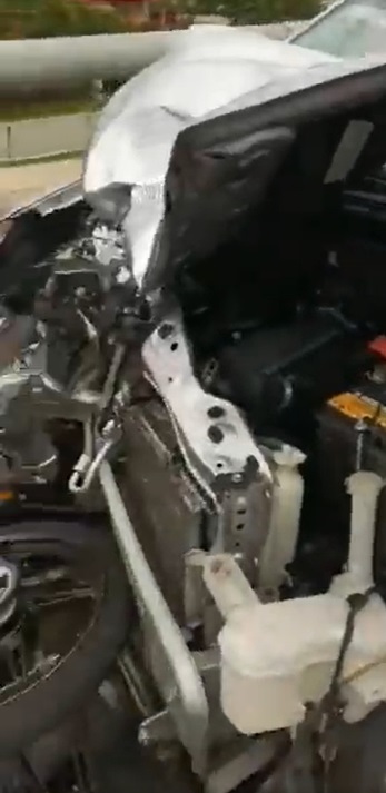 另一个视频则显示,这辆轿车最终被迫停下,因为轿车猛撞一辆迎面驶来的摩托车,导致轿车的车头严重损毁,摩托车骑士则躺在地上一动不动,伤势不明。