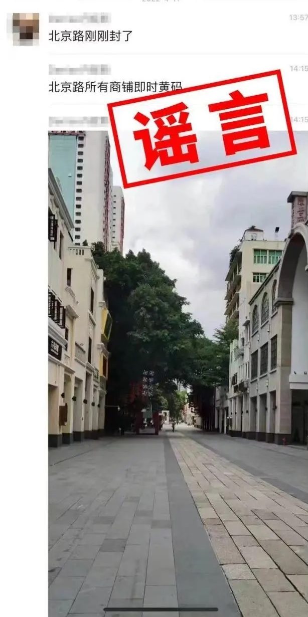 南方报业传媒集团官方新闻客户端“南方PLUS”报道指出,谣言是来自微信聊天记录截图,其中也附上了广州北京路街道空无一人的照片。