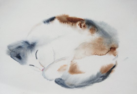 那时,阿胖身前总有一个小瓦钵,里头是七分满的猫粮,另外三分已经稳妥地在彼时已初具规模的小腹中,酝酿,与等待出路了吧。像人一样,过于干涩的饭,总是难以下咽,必需浇上一些菜汁,才吃得粒粒皆香。大概也是这个原因,那七分未入口的猫粮,才因此静置许久。阿胖并不着急,它审视来人,时而瞇眼吐纳,时而霍霍扫视。直到我母将盛满水的碟子,轻轻地放在小瓦钵旁,阿胖才弓起身子,慵懒地低头舔一舔碟子里的水。阿胖舔水的动作总是那么优雅,前胸那一片V字的白,像是有教养的小孩在进餐时系的白色方巾。后来,阿胖不愿舔碟子里的水,转而待我母每回在水喉底下洗手的时候,跳上台边,伸缩它那像乌鱼子的舌头,舔弄盛水的掌心。阿胖是喜欢混有手汗的咸涩的水,还是作为一种宣示主从的秘仪,就不得而知了。
