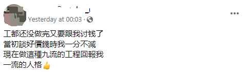 该帖文引起网民关注,纷纷留言建议女子先别付款,因为装修公司的手工的确太差,“要他们拆掉重做”、“这根本是几个月经验学徒的手工”、“装修工人缺的是德”。