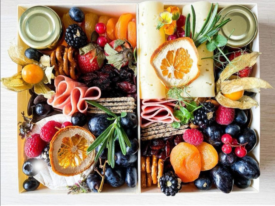 芝士拼盘有多绚丽和吸睛?以一款经典的芝士拼盘为例,里面就有十多种食材,包括芝士、葡萄、奇异果、芒果、草莓、蓝莓、杏仁、巧克力、脆饼、蜂蜜、橘子干等等,有甜有咸,硬的软的脆的,各种口感都能找得到,搭配鲜花和果干作为装饰,不同的食材拼凑出新颖的味蕾和视觉体验。