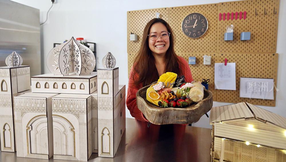 拼盘还可加入一些食材或装饰来“应节”。配合来临的开斋节,黄家仪特别在拼盘中加入传统零食Batang Buruk(朽木饼)、椰枣、椰子糕(Dodol)、千层糕等,并且把食材装在高脚屋和皇宫造型的木盒里,让传统小吃和新颖的摆盘包装方式相映衬,营造节日气氛。