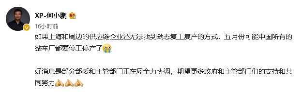 上海供应链若无法复工  小鹏汽车: 中国所有车厂5月或停工