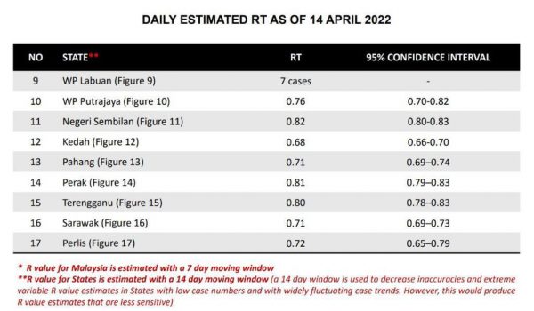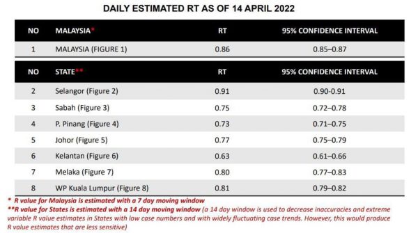 Kadar kebolehjangkitan Covid-19 atau Ro/Rt pada jangkaan mengikut kes seharian pada 14 hb April 2022 untuk seluruh negara adalah 0.86. Manakala pecahan mengikut negeri adalah seperti di lampiran pic.twitter.com/X9GVB5UYhb