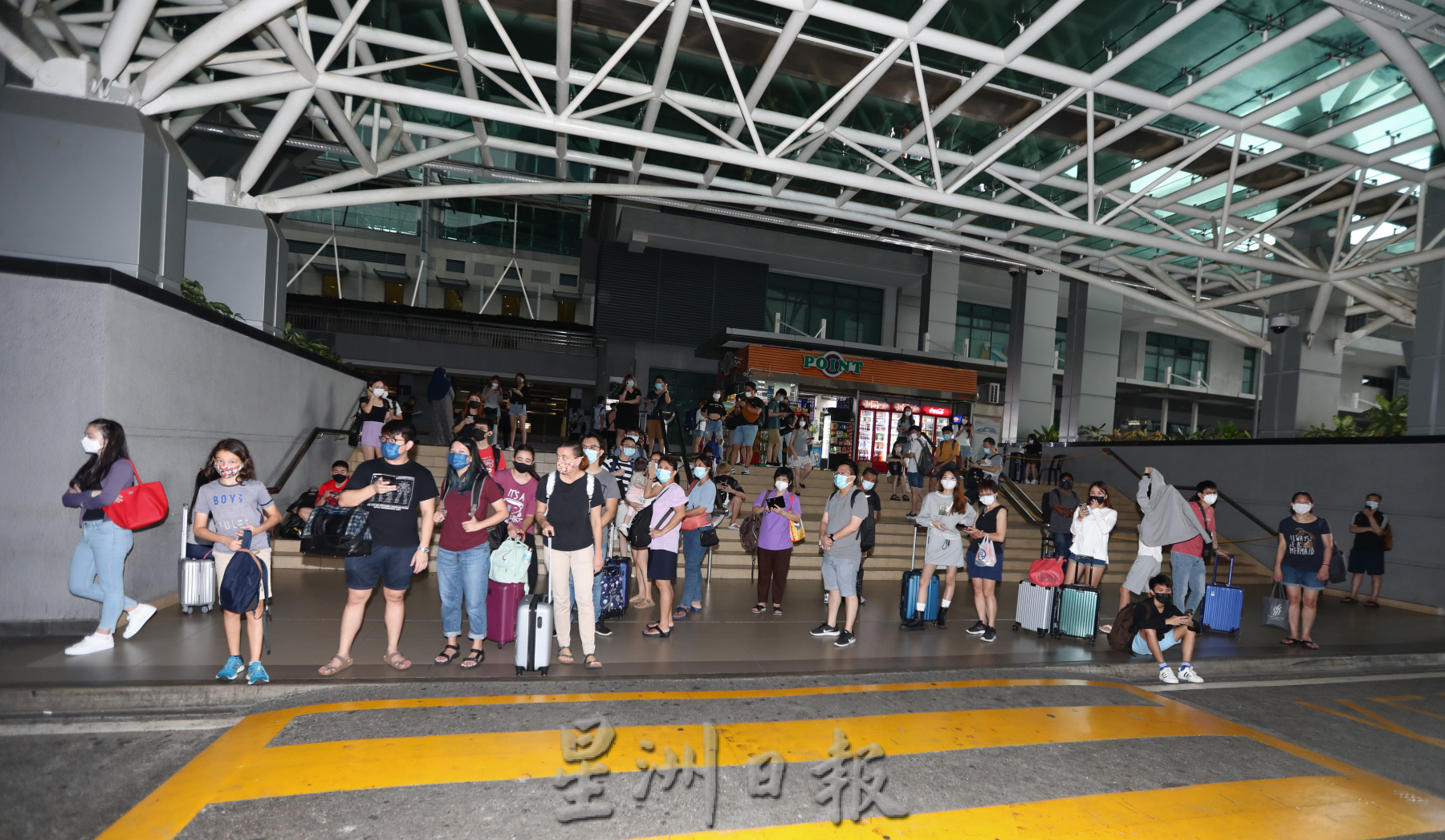 周五一大清早,新山苏丹依斯干达大厦外可见许多刚入境的民众,在等待德士、电召车司机或家人。(陆家明摄)