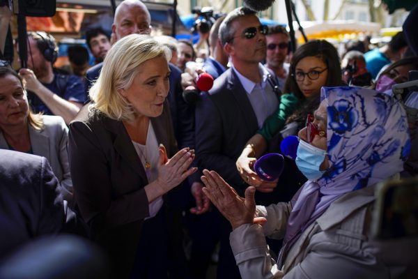 马琳勒庞周五访问南部的佩尔图斯镇时,被一名戴着头巾的穆斯林妇女围堵。
