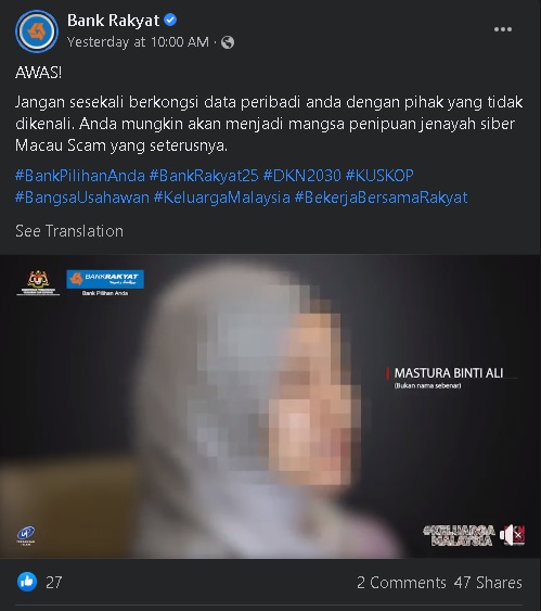 (八打灵再也17日讯)人民银行(Bank Rakyat)分享一名“澳门骗局”受害者的亲身经历,呼吁人民不要轻易上当而泄露自己的个人及网络银行资料!
