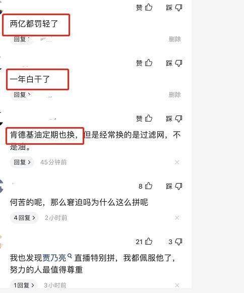 贾乃亮在直播隔天,当着直播间10多万粉丝的面前正式道歉,表示自己上一场带货时为了推广产品,说了不恰当的话语,自己有不对的地方,希望可以私下和平解决。不少网民表示支持贾乃亮,高喊“亮哥我们挺你”、“难道肯德基的油炸一遍就丢了?”、“贾乃亮说的是事实啊,有什么毛病”,但也有网民批他为了突出自己的产品,诋毁其他品牌,显得有点不厚道,并指快餐品牌的油定期会换,意外引起网络热议。