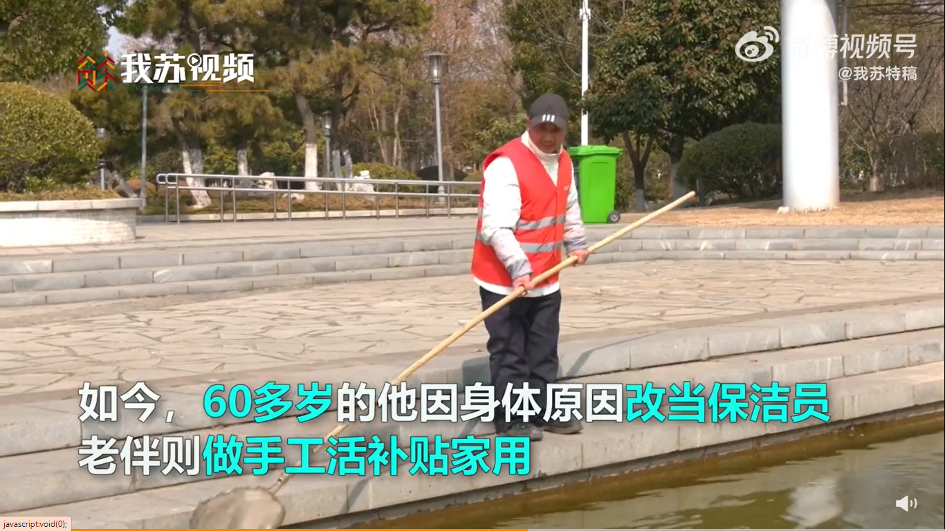 他说,如今他因年事已高、身体原因而改当保洁员,老伴则做手工活贴补家用。
