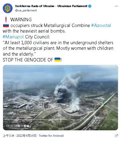 乌克兰市议会发布影片,显示钢铁厂受俄军重型炸弹袭击后冒出大量浓烟,批评俄军明知钢铁厂内的平民,仍开火攻袭。